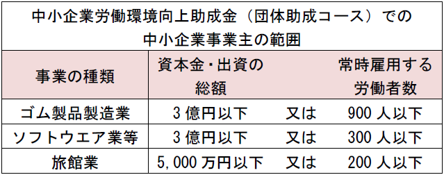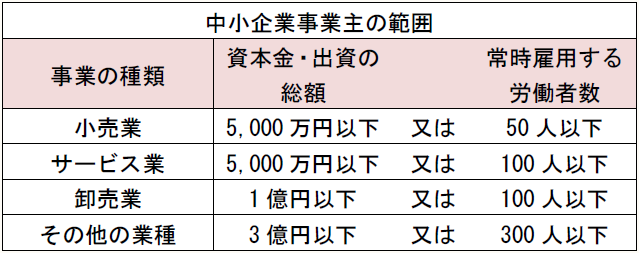 雇用関連助成金は中小事業主に限定して対象とするものや、支給額が中小事業主とそうでない事業主では異なることもあるので、中小企業事業主であるか否かは重要である。雇用関連助成金で定める中小企業事業主の範囲は次のものである。
