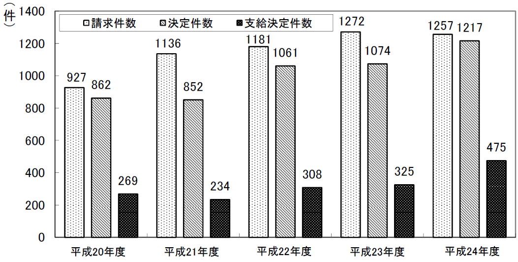 特に平成24年の支給決定件数は大幅に増加しているが、これは後で解説する「心理的負荷による精神障害の労災認定基準」が定められた影響が大きいと考えられる。