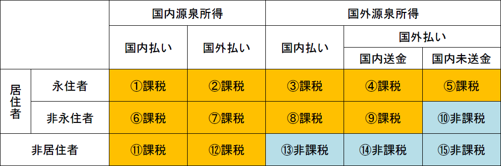 国外での勤務に対する給与なので「国外源泉所得」にあたるが、日本の居住者(永住者)であるため、日本での納税義務がある(上記表中③に該当、通常どおり給与から源泉所得税を控除し、税務署に納める必要があり)。