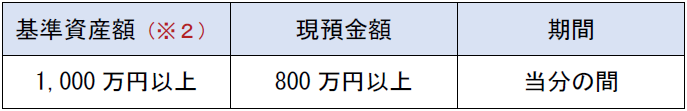 基準資産額 基準資産額 (※2) 現預金額 現預金額 期間 1,000 万円以上 万円以上 800 万円以上 万円以上 万円以上 当分の間 当