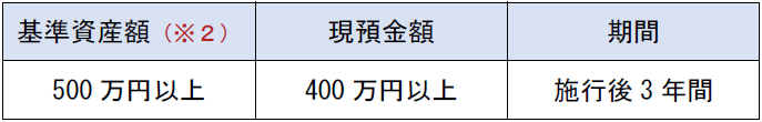 基準資産額 基準資産額 (※2) 現預金額 現預金額 期間 500 万円以上 万円以上 万円以上 400 万円以上 万円以上 万円以上 施行後 施行後 3年