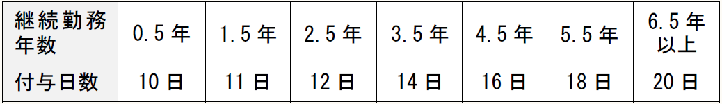 有給休暇は、①6ヶ月の継続勤務、②その期間中の全労働日の8割以上出勤している正社員に対して、「10日」付与されます。その後1年経過ごとに、直近1年間の出勤要件である②を満たせば、勤続年数に応じて次の〔図表1〕の通りの有給休暇が付与されます。