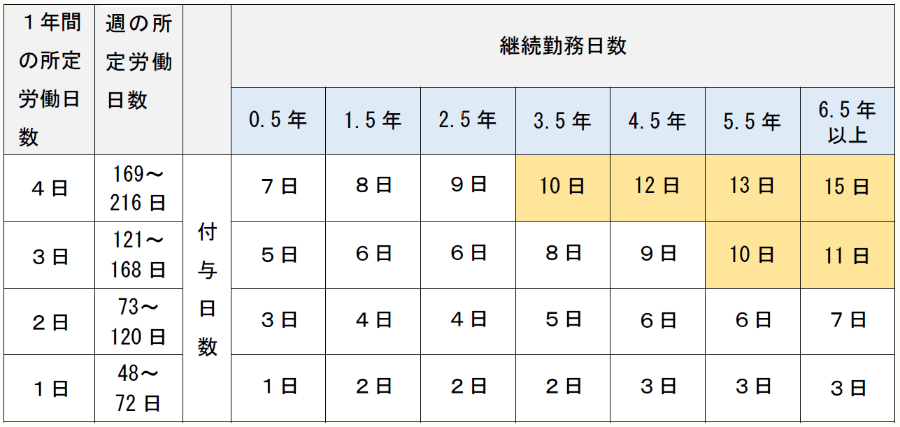 所定労働日数が「週3日」であれば「勤続年数5.5年以上」、「週4日」であれば「勤続年数 3.5 年以上」の従業員については、パートタイマーであってもこの対象となるのです。