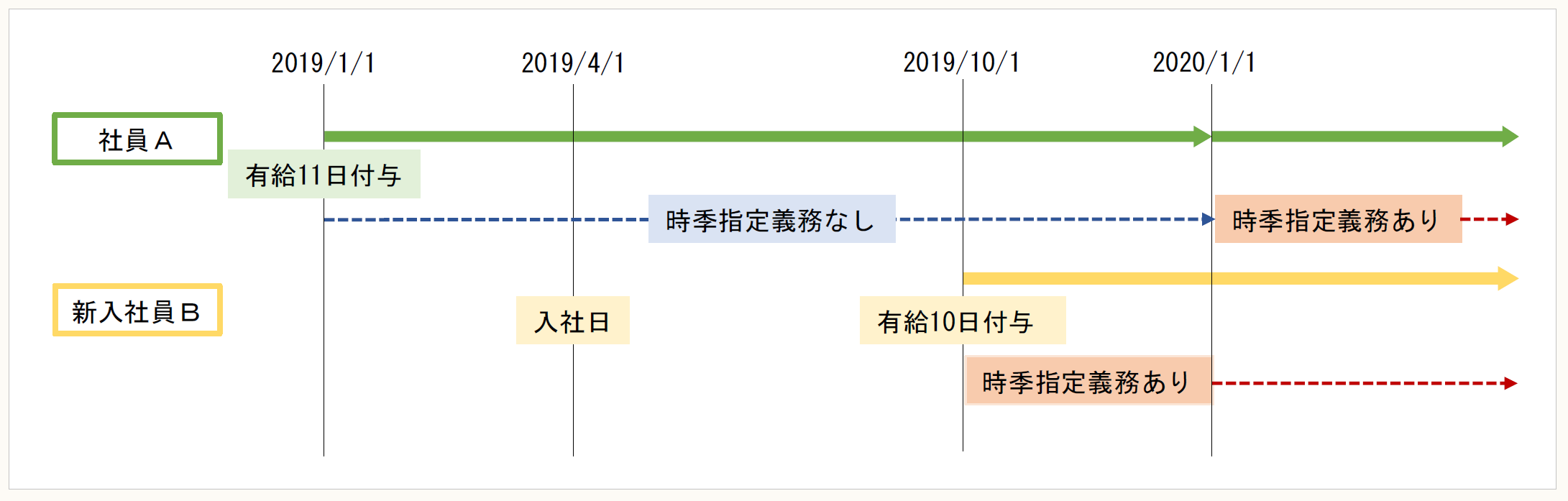 入社2年目の社員Aは2019年1月1日に「11日」の有給休暇が付与されました。また、2019年4月1日に入社した新入社員Bは、半年後の10月1日に有給休暇が10日付与されます。