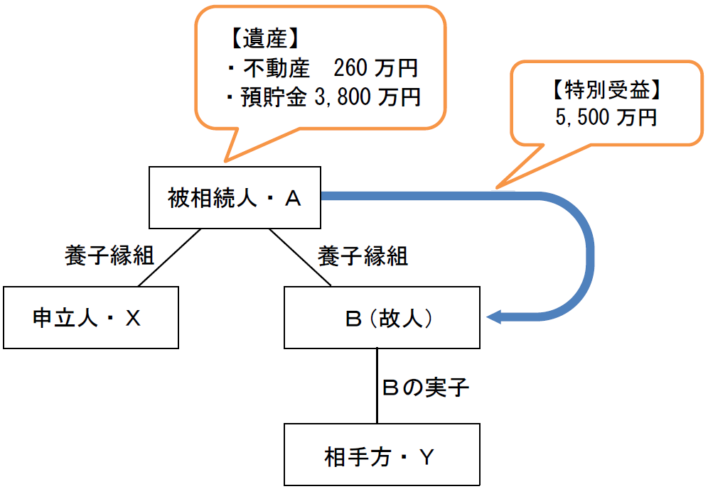 ◆被相続人Aの相続人は、申立人X・相手方Yの2名のみで、法定相続人は各2分の1である(申立人Xは被相続人の子(養子)、相手方Yは被相続人の子B(養子・故人)の子であり被相続人を代襲相続している)。