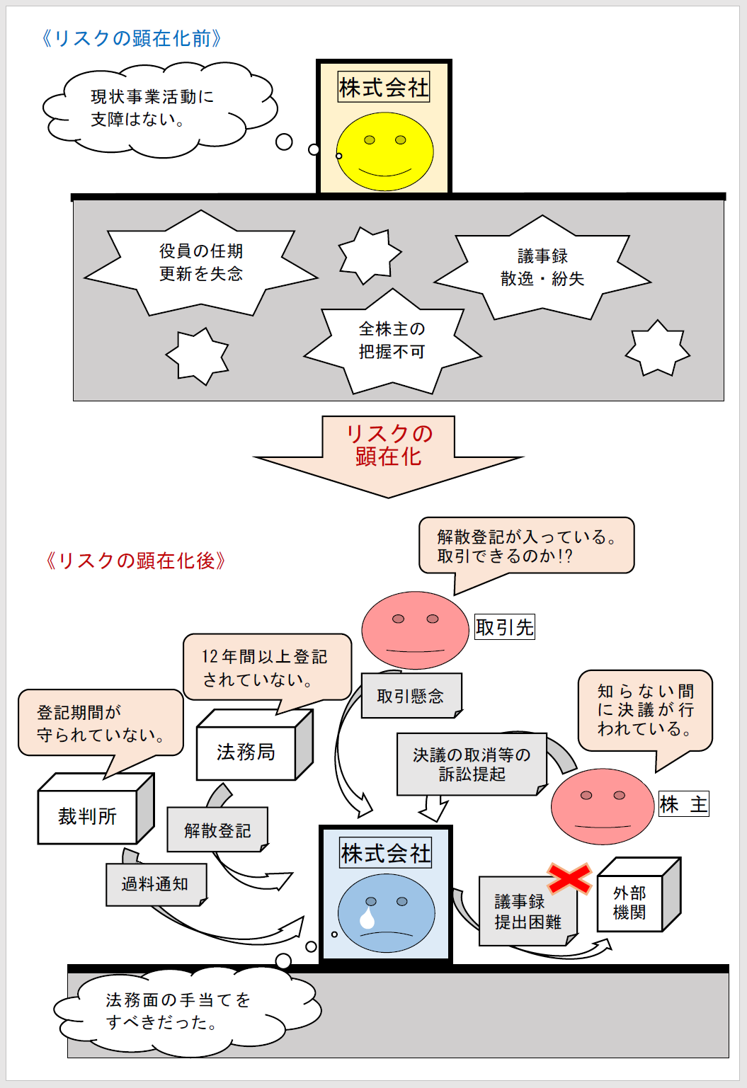 事業活動の好不調にかかわらず、登記管理は適宜行う必要がある。リスクが潜在的にとどまっている間は、目の前の事業活動に直接的な影響が及ばないため、手当てを施す必要がないように思える。しかし、手当てをしない期間が長くなるにつれて潜在的なリスクが顕在化し、事業活動に打撃を与えるおそれが高まる。