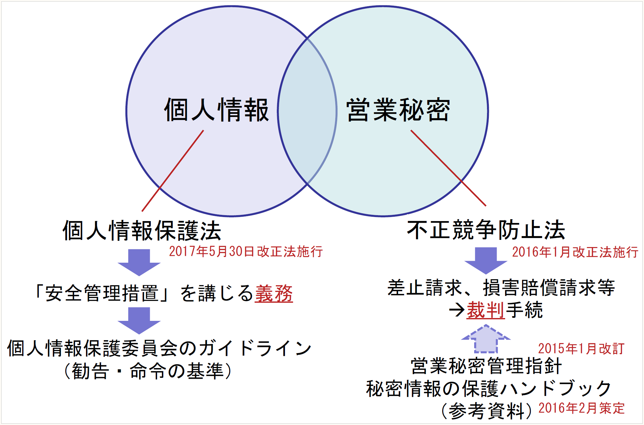 会社が管理すべき情報には、大きく分類すると「個人情報」と「営業秘密」の2種類がある。個人情報は「個人情報保護法」がこれを保護しており、営業秘密は「不正競争防止法」がこれを保護している。