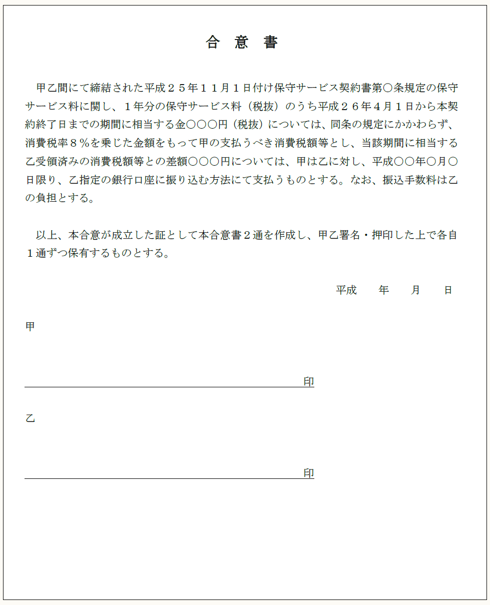 その場合、以下のような合意書にて修正合意することが考えられる。
