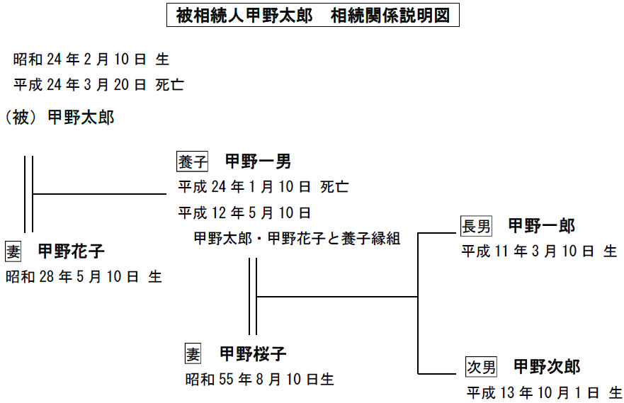上図のような相続事件が発生したとしましょう。被相続人は甲野太郎です。