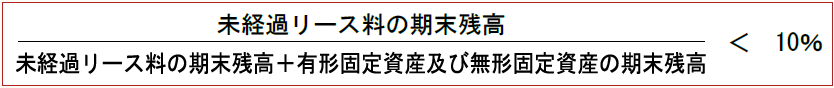 具体的な判定は、「未経過リース料の期末残高」の「未経過リース料の期末残高+有形固定資産及び無形固定資産残高の合計額」に対する割合で行い、これが10%未満の場合、リース資産総額の重要性は乏しいと判断する(適用指針32)。