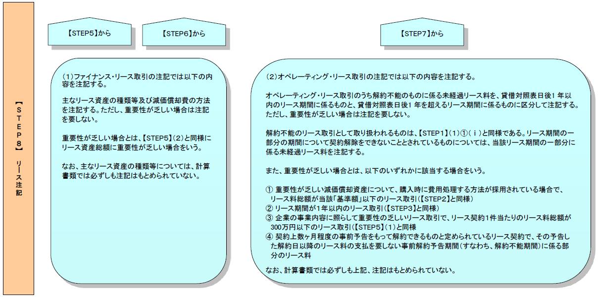解約不能のリース取引として取り扱われるものは、【STEP1】(1)①(ⅰ)と同様である。リース期間の一部分の期間について契約解除をできないこととされているものについては、当該リース期間の一部分に係る未経過リース料を注記する(適用指針74)。