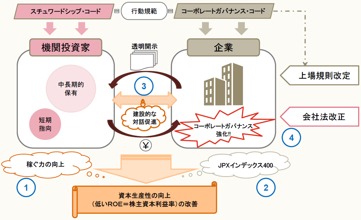 そこで、2014年6月に閣議決定された「日本再興戦略2014」においては、企業の稼ぐ力(中長期的な収益性・生産性)の向上にむけたコーポレートガバナンスを強化するため、「CGコード」の策定が掲げられた。また、企業にとって投資魅力度の高い企業で構成された「JPXインデックス400」が策定され、その選定基準の加点要素の一つに、社外取締役の選任が含められた。企業に「JPXインデックス400」に選定されるというインセンティブを与え、コーポレートガバナンス強化を目指す企業を後押しする仕組みが設けられている。