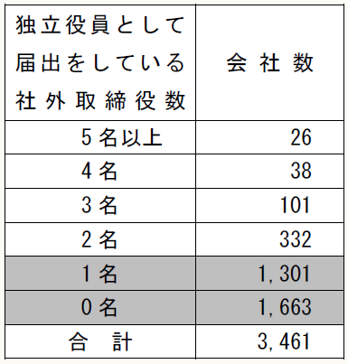 とはいえ、次表の通り、東証に上場する3,461社のうち、約86%(2,964社)は、届け出られた独立社外取締役が2名未満である(本稿執筆現在(2015/4/20))。