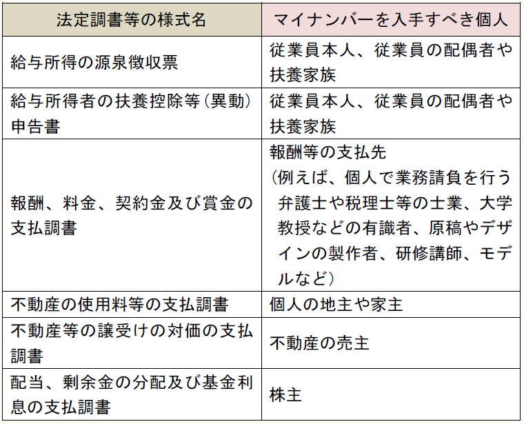 (※) マイナンバーを入手する個人別に行う。つまり、代表例をまとめた上表の「マイナンバーを入手すべき個人」として記載した相手先ごとに行う。具体的には、「従業員」、「従業員の配偶者」、「従業員の扶養家族」、「個人の地主」、「株主」単位という意味である。