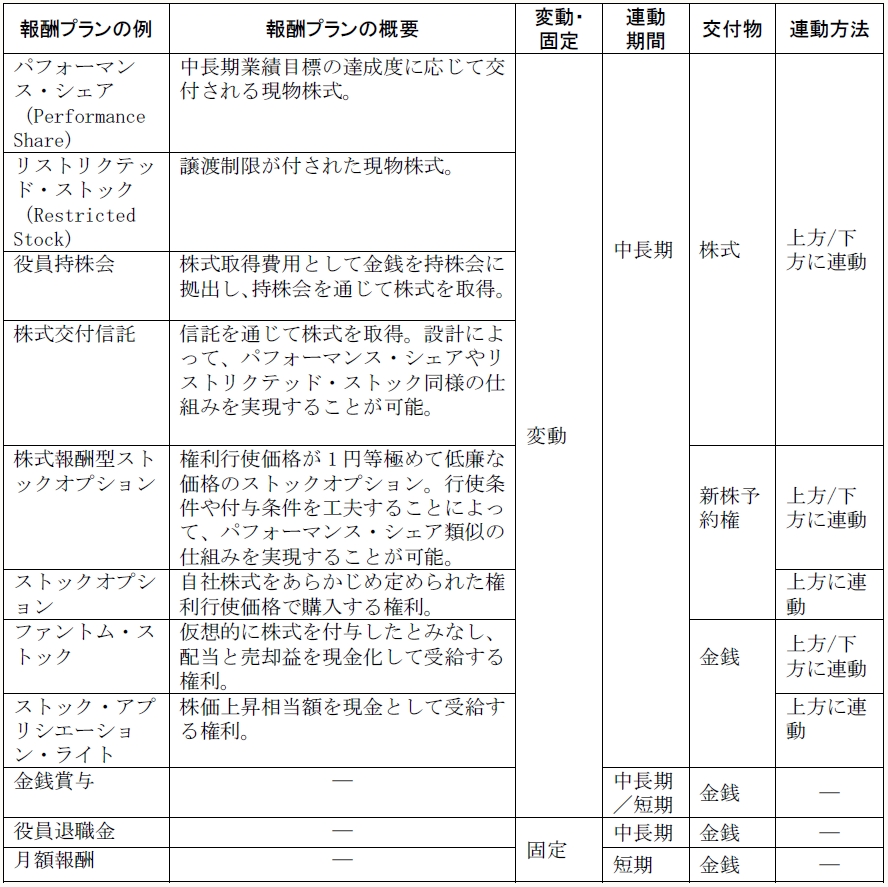 経産省報告書では、諸外国でみられる各種報酬プラン等を基に、各種報酬プランをまとめている。それが下表である。