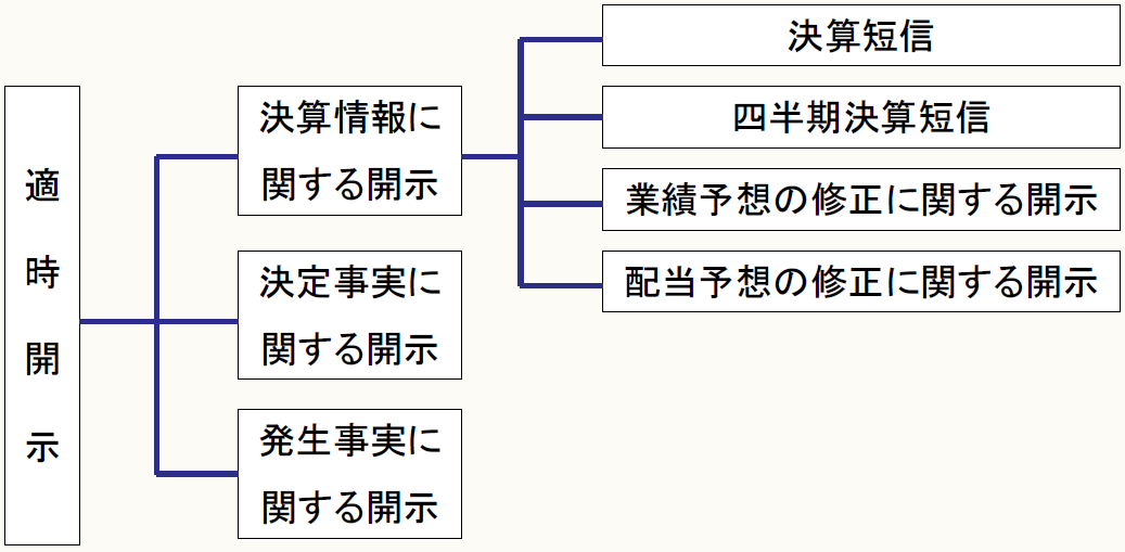 「適時開示」とは、証券取引所が、その証券市場に有価証券を上場している会社に対して、投資家の投資判断への影響が大きいと考えられる情報の開示を求めるものであり、適時開示が求められる情報は「決算情報」「決定事実」「発生事実」の3種類に分けられる。