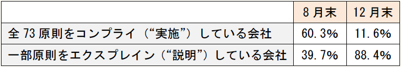 8月末 12月末 全73原則をコンプライ(“実施”)している会社 60.3% 11.6% 一部原則をエクスプレイン(“説明”)している会社 39.7% 88.4%