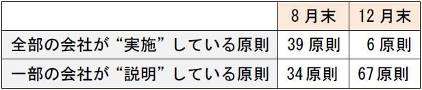 8月末 12月末 全部の会社が“実施”している原則 39原則 6原則 一部の会社が“説明”している原則 34原則 67原則
