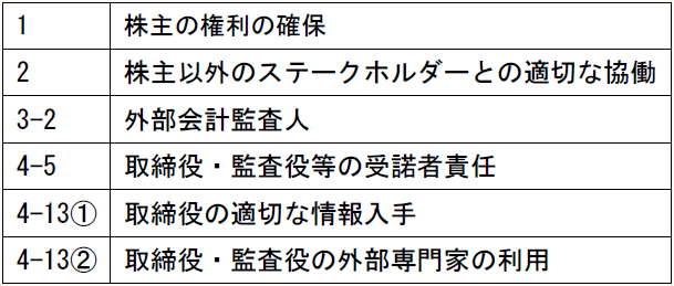 1 株主の権利の確保 2 株主以外のステークホルダーとの適切な協働 3-2 外部会計監査人 4-5 取締役・監査役等の受諾者責任 4-13① 取締役の適切な情報入手 4-13② 取締役・監査役の外部専門家の利用