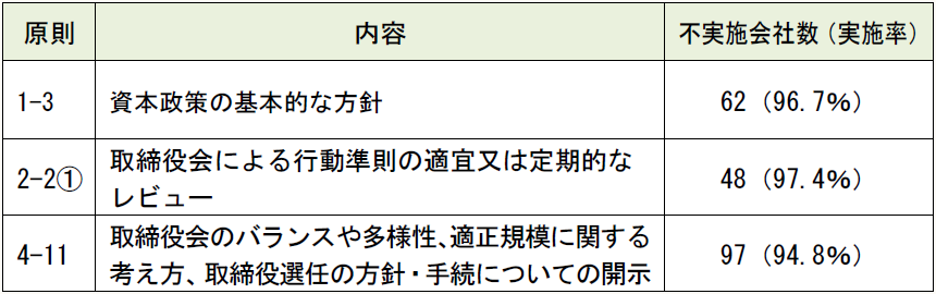 原則 内容 不実施会社数 (実施率) 1-3 資本政策の基本的な方針 62(96.7%) 2-2① 取締役会による行動準則の適宜又は定期的なレビュー 48(97.4%) 4-11 取締役会のバランスや多様性、適正規模に関する考え方、取締役選任の方針・手続についての開示 97(94.8%)