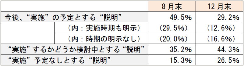 8月末 12月末 今後、“実施”の予定とする“説明” 49.5% 29.2% (内:実施時期も明示) (29.5%) (12.6%) (内:時期の明示なし) (20.0%) (16.6%) “実施”するかどうか検討中とする“説明” 35.2% 44.3% “実施”予定なしとする“説明” 15.3% 26.5%
