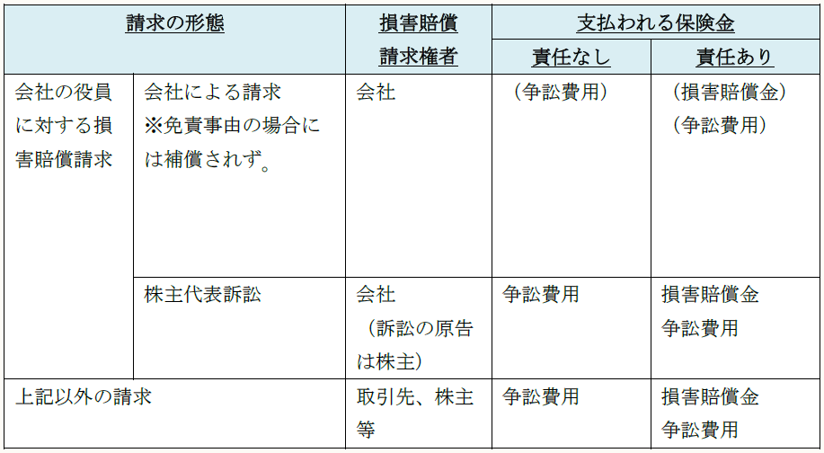 経産省解釈指針別紙2では、D&O保険の一般的な補償の範囲として以下の表を掲示しており、参考になる(p2)。