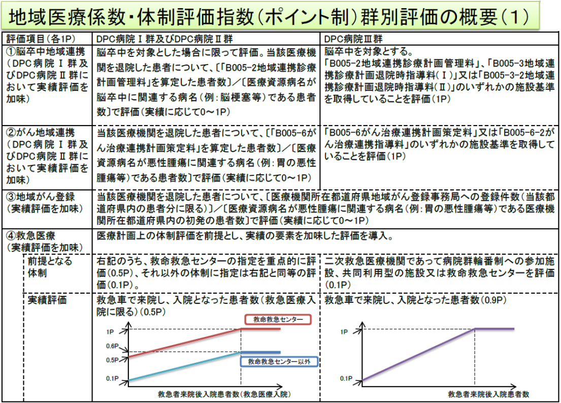 2012年度診療報酬改定では、医療機関群(Ⅰ群・Ⅱ群・Ⅲ群)の設定が行われ、DPC対象病院全体で評価された項目(データ提出係数、効率性係数、救急医療係数)と医療機関群ごとに評価された項目(複雑性係数、カバー率係数、地域医療係数)に分かれた。これらは医療機関の質的側面を評価したものであり、DPCに参加するか否かにかかわらず、今、急性期病院に求められていることが凝縮されている。