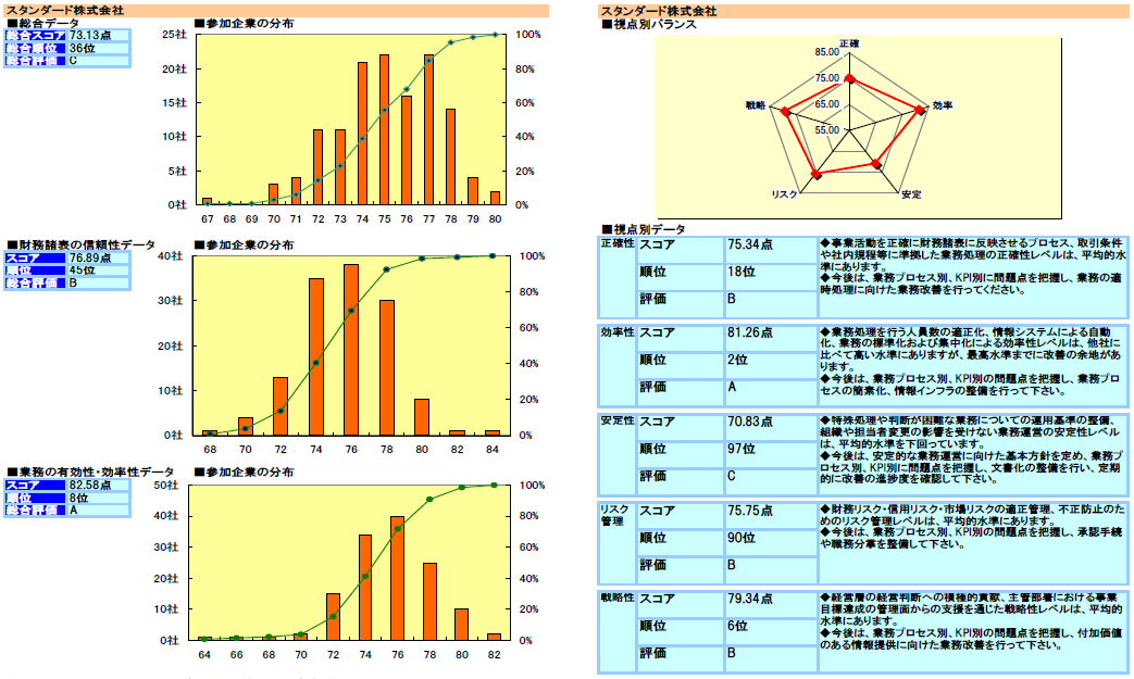 読者が顧問先に対してスコアリングモデルを活用すれば、図表1・図表2のような資料を作成することができ、客観的なデータの裏付けをもって、顧問先の経理財務部門の業務の問題点を診断することが可能となる。