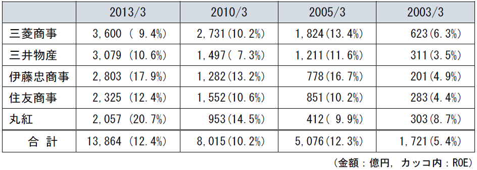 2003年から2013年までの10年間の変化をみると、5社合計で純利益は8倍、ROEは2倍強と著しい改善がみられる。東証第一部1319社(金融含む)のROEは2013年3期が5.57%、2012年3期が4.79%であるから、2倍を上回る実績である。