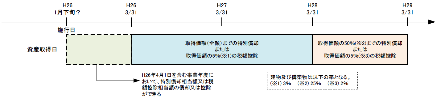 さらに、同法施行日から平成28年3月31日までの間に取得等をしたものについては、普通償却限度額との合計でその取得価額(全額)までの特別償却、またはその取得価額の5%(建物及び構築物については3%)の税額控除のどちらかを選択適用できる。
