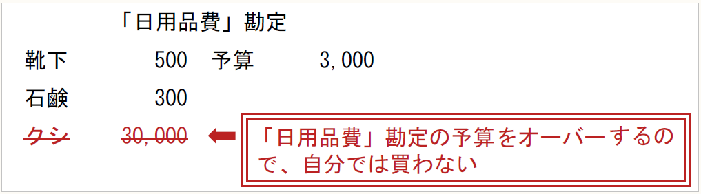 このように、人は無意識のうちに、ココロの中にいろいろな勘定を持っていて、収入や支出を各勘定に振り分け、その勘定の中でやりくりをしています。ココロの勘定は、個人のお金の使い過ぎやムダ遣いを防ぐための、セルフコントロールシステムとして機能しています。