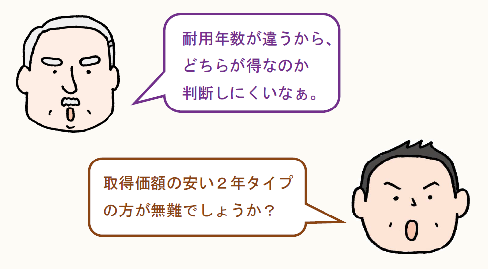 でも、2つの設備の耐用年数が違うから、単純には比較できなくてね。