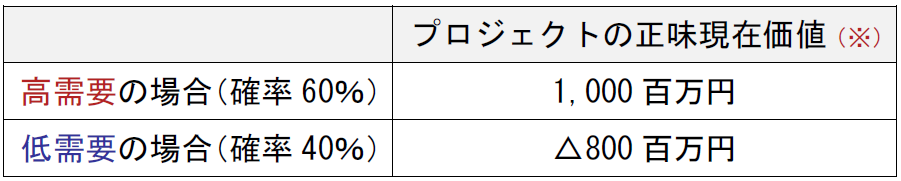 ● PN社では、今月中に新製品製造のための設備投資を実行するかどうかを検討している。現時点では新製品の市場需要は不透明であり、需要が高い確率を60%、需要が少ない確率を40%と見込んでいる。実際の市場需要が判明するのは1年後と考えられている。