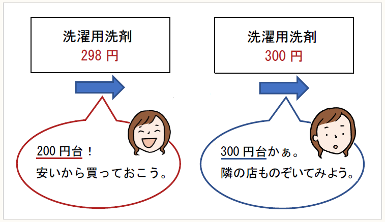 「端数価格」と呼ばれるもので、スーパーなどの小売業界でよく見かける価格設定です。298円と300円の差はごくわずかなのですが、一番大きな桁が違うので、298円のほうが割安な印象を与えて、購入してもらいやすいのですね。ただし、格安ブーケに対するリミちゃんの反応のように、品物によっては安物感が漂ってしまうこともあるようです。