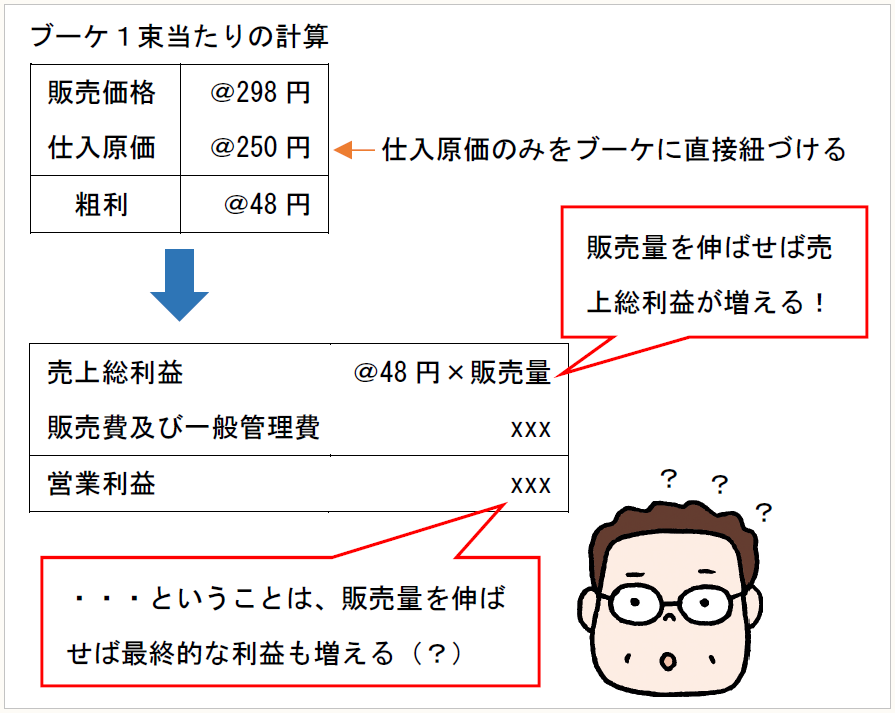 ハナダ店長は、ブーケに直接紐づけるコストとして、花の仕入原価250円のみを考えています。そして、販売価格(298円)から仕入原価(250円)を差し引くと粗利(48円)が生じることをもって、「ブーケ販売による利益が出ている」と考えているようです。この考え方は、売上から売上原価を差し引いて売上総利益を算定するという決算書(損益計算書)と同じ方式で、〈財務会計的な発想〉と言えます。