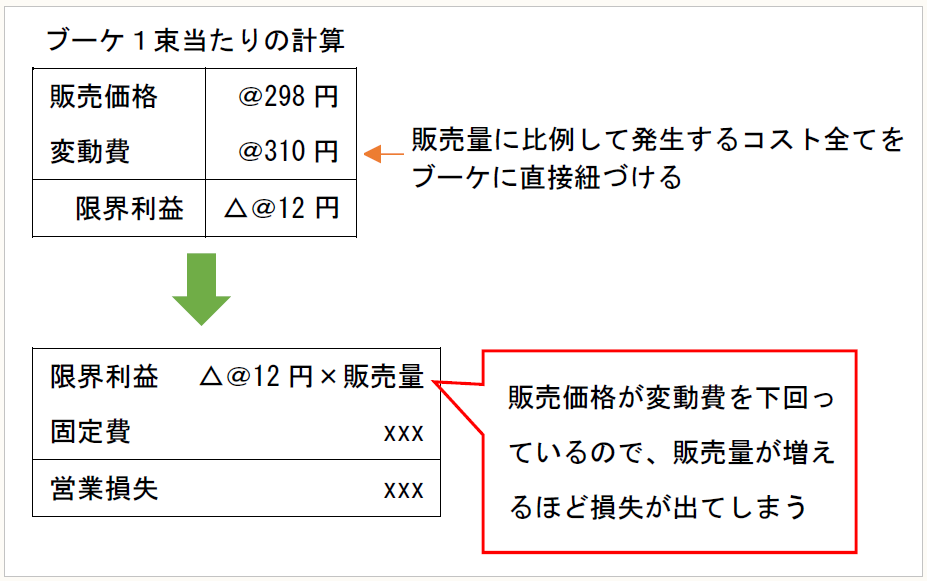 2人がコストを分類したところ、花の仕入原価の他に、ブーケ1束につき包装費や消耗品費などの変動費が60円かかることがわかりました。ブーケ1束当たりの変動費合計は、花の仕入原価250円+包装費など60円=310円です。販売価格は298円ですので、ブーケ1束を販売するごとに12円の損失になっています。