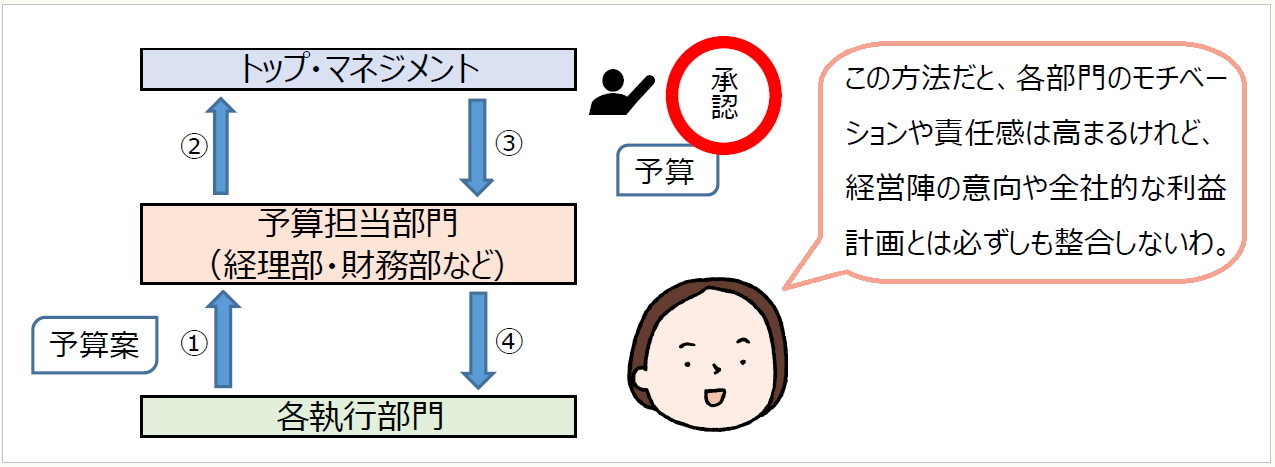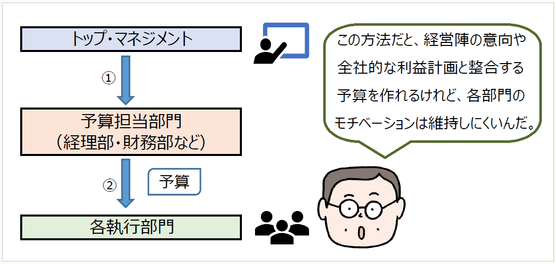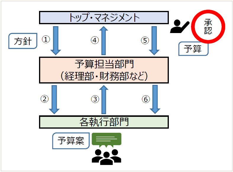 予算編成の方法は企業によって様々ですが、“予算編成の主体がどこか"という観点からは、トップ・ダウン型の予算編成とボトム・アップ型の予算編成を想定することができます。