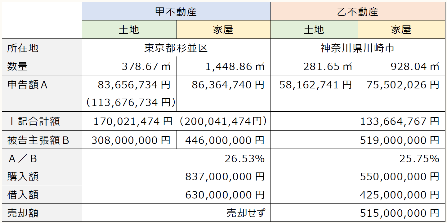 被相続人Aは、平成24年6月17日に94歳で死亡し、相続人である原告らほか2名がその財産を相続により取得した。被相続人の相続財産には、東京都杉並区所在の8階建てマンションに係る土地及び建物(甲不動産)並びに神奈川県川崎市所在の7階建てマンションに係る土地及び建物(乙不動産)が含まれていたところ、これらについては、被相続人の遺言に従って、原告らのうちの1名が取得した。なお、同人は、平成25年3月7日付けで、本件乙不動産を5億1,500万円で第三者に売却した。
