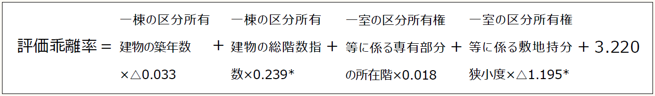 当該評価方法において中心となる概念は、市場価格と(従来の)相続税評価額との乖離を示した「評価乖離率」である。ここでいう評価乖離率とは、通達によれば以下の算式で求めた値となるが、当該算式中の4つの指数は、相続税評価額が市場価格と乖離する要因である「築年数」、「総階数」、「所在階」及び「敷地持分狭小度」にそれぞれ対応する(※7)。