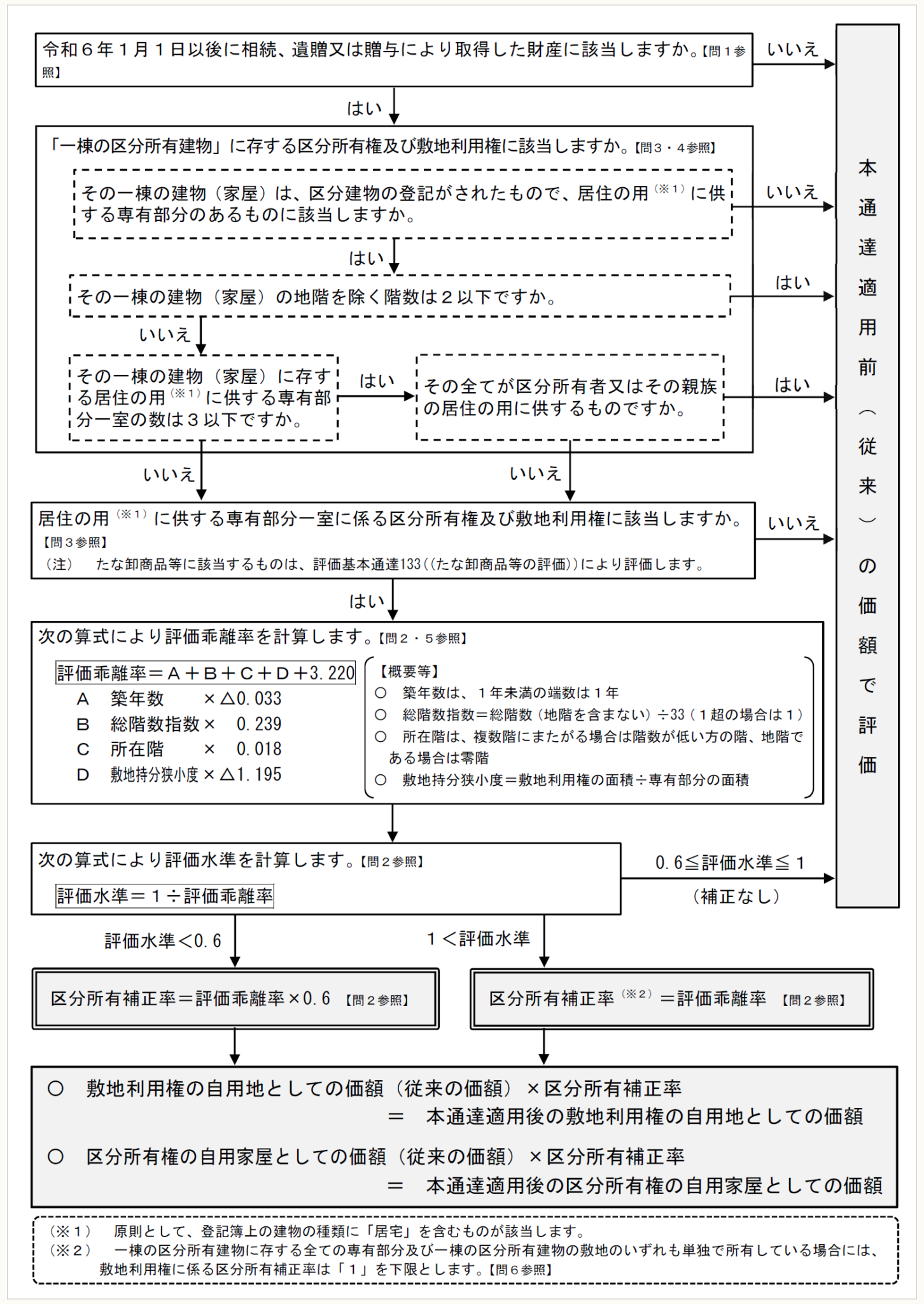 国税庁が令和6年5月14日付で公表した資産評価企画官情報第2号「居住用の区分所有財産の評価に関するQ&A」(情報)の別添2頁に、通達に基づく評価方法のフローチャートが掲載されているので、以下に転載しておく。