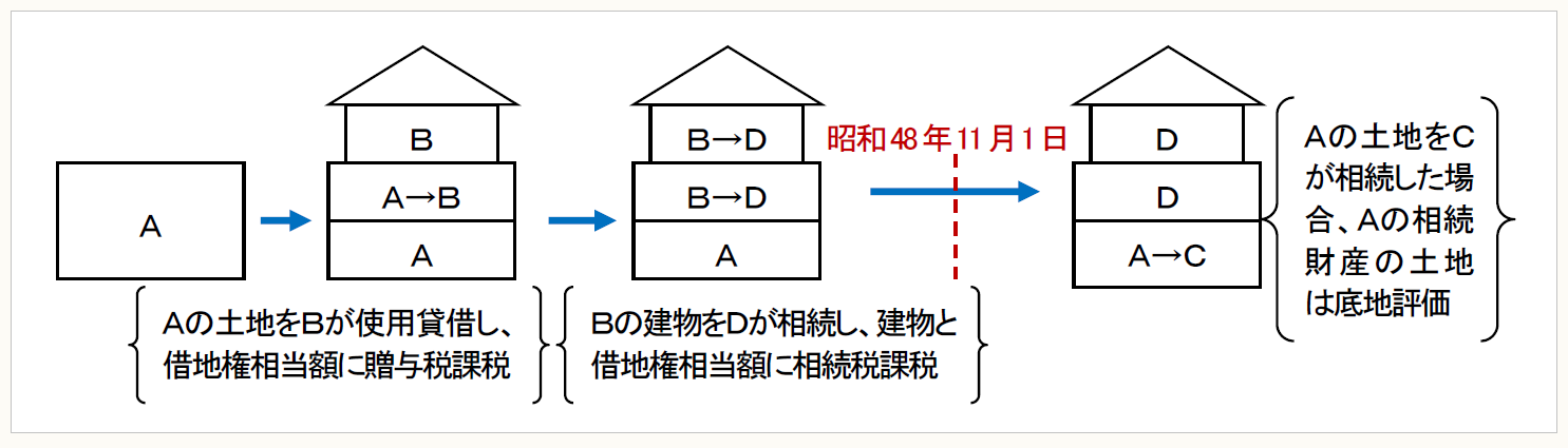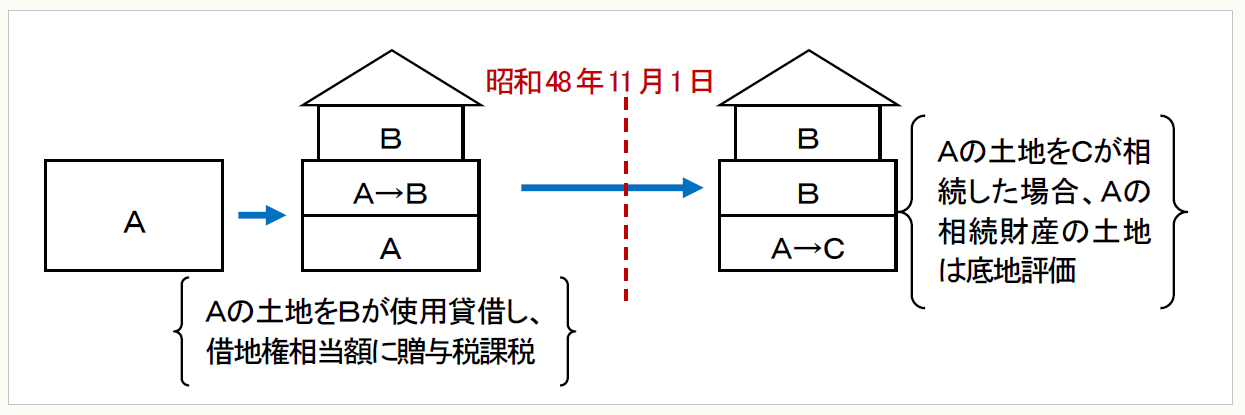ただし、ここで言う借地権相当額の贈与税が課税されているか否かは、実際に課税が行われていたかどうかによらず、その時期によって課税が行われていたものとして取り扱うこととされています。ただし、昭和46年12月31日以前において各国税局により取扱いに相違があり、例えば、東京国税局(昭和49年1月26日付 直資第219号)では昭和22年5月3日以降行われていたとされていますが、大阪国税局(昭和49年1月10日付 大局資(審)第7号)では昭和40年1月1日以降となっており、注意が必要です。