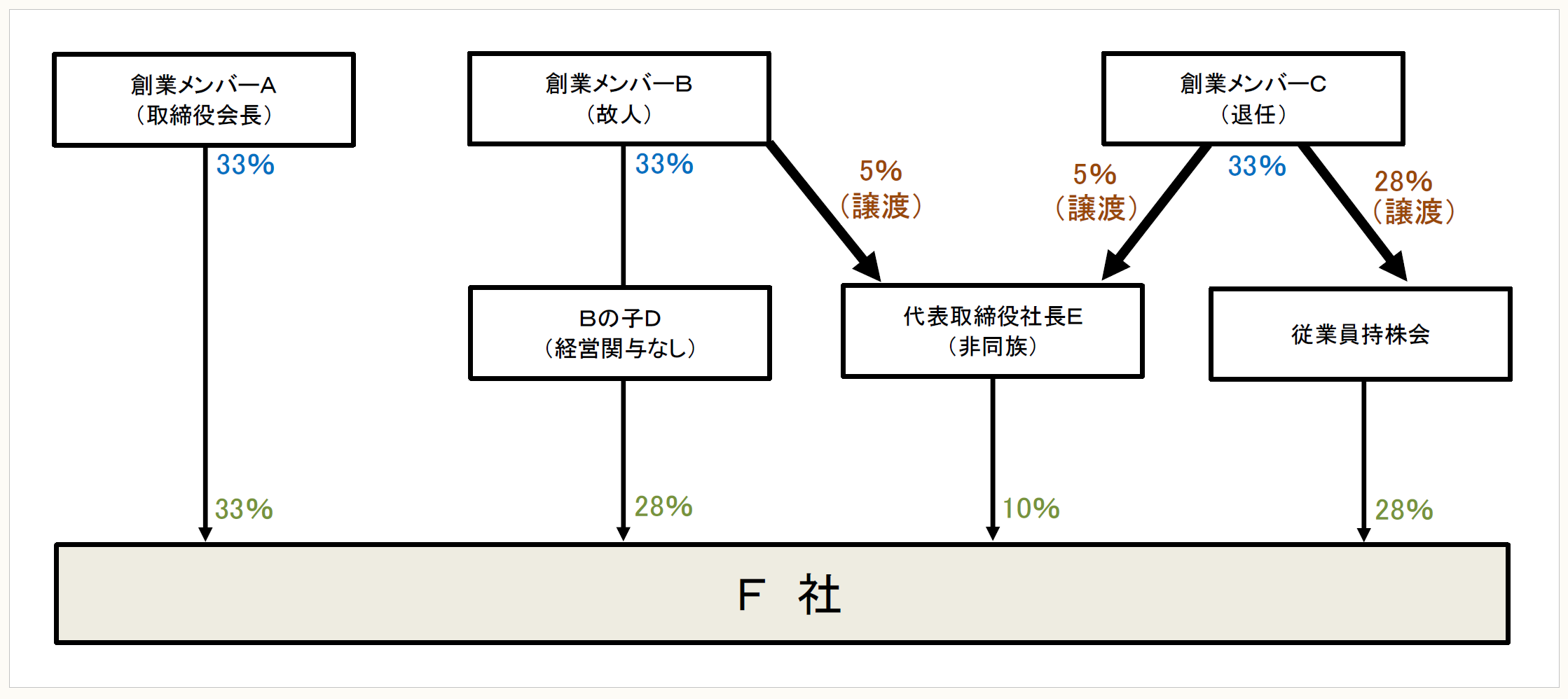 私は当社の創業メンバー3名(A・B・C)と親族関係にはありませんが、設立直後から創業メンバーの3名を支えてきた功績が認められ、F社の経営を託されることになりました。