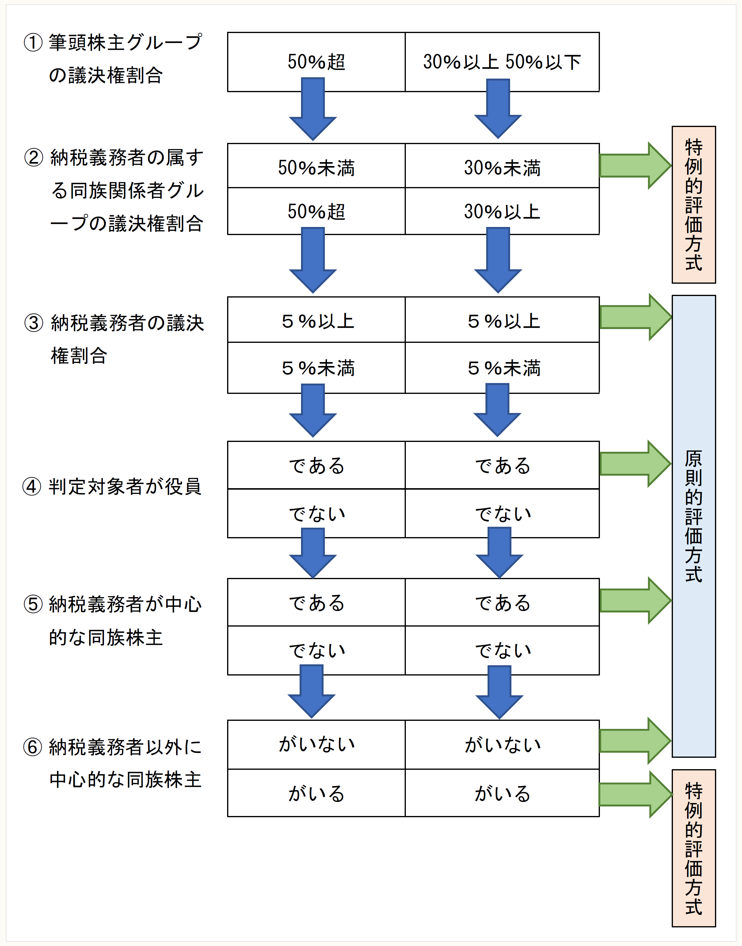 同じ40%の議決権保有割合であったとしても、他の株主の議決権保有割合によって評価方式が異なることになりますので、次の株主判定の手順を踏まえて、株主の判定を行うことが重要となります。