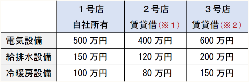 A社は飲食店業を営んでいます。1号店は自社所有の建物ですが、2号店及び3号店は賃借している建物です。