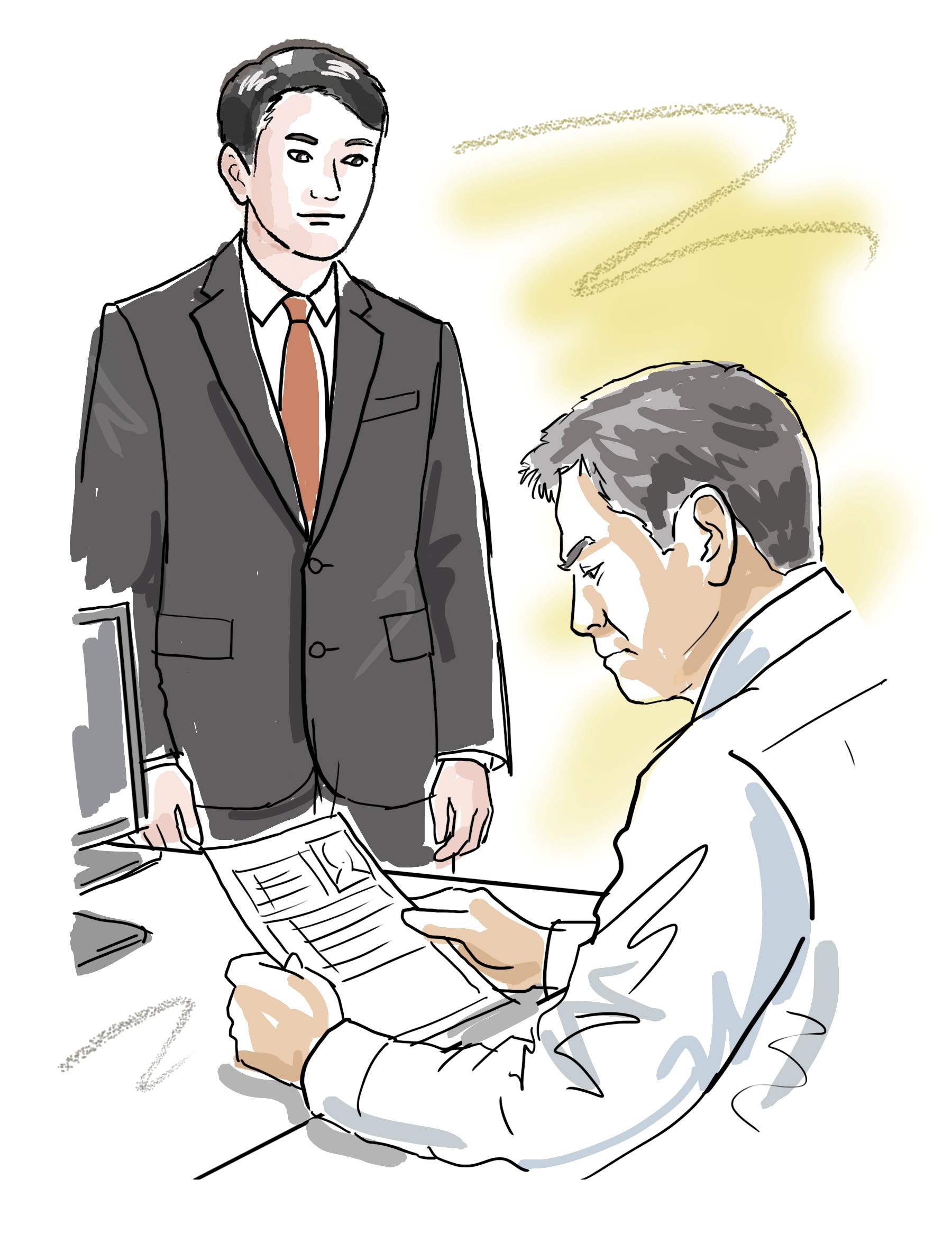 新任の挨拶で、永途は少し緊張しながら、田中審判官の前に立っている。