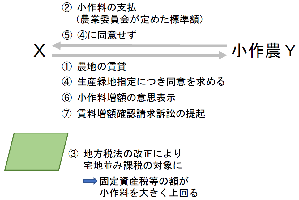 Xは、市街化区域内に所有する農地を、農業委員会が定めた小作料にて、小作農Yに賃貸していた。ところが、地方税法の改正により、当該農地が宅地並み課税の対象となった。これにより、固定資産税等の額が小作料を大きく上回るようになってしまった。