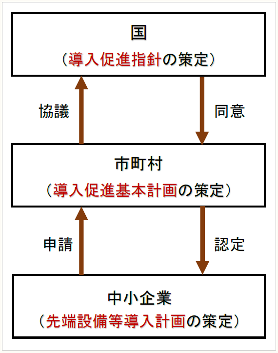 そのため、まず、国が中小企業者の先端設備等(注)の導入の促進に関する指針(導入促進指針)を定め、次に、市町村が、導入促進指針に基づき、先端設備等の導入の促進に関する基本的な計画(導入促進基本計画)を作成し、国と協議して、その同意を求める。