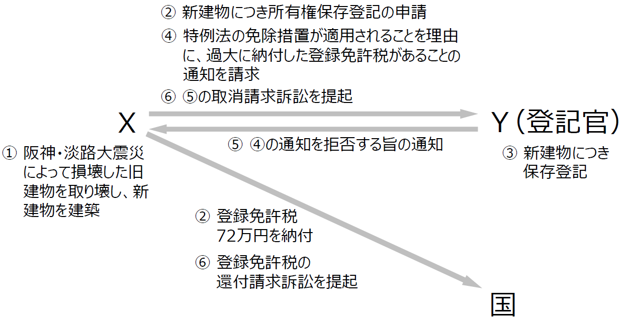 Xは、阪神・淡路大震災によって、自己が所有する建物が損壊したため、これを取り壊し、新しい建物を建築して、Y(登記官)に対し、当該建物についての所有権保存登記の申請をした。また、これに関し、登録免許税72万円を納付した。これを受けて、Yは、新建物について保存登記をした。
