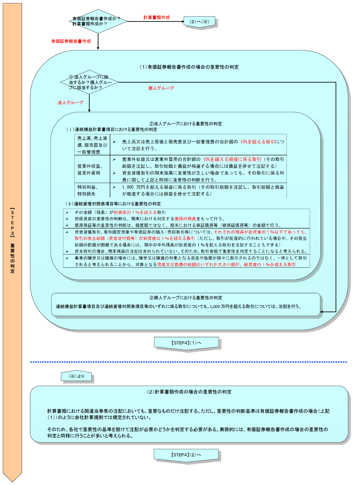 有価証券報告書作成の場合と計算書類作成の場合で検討過程が異なるため、有価証券報告書作成の場合は(1)と計算書類作成の場合は(2)を検討する。