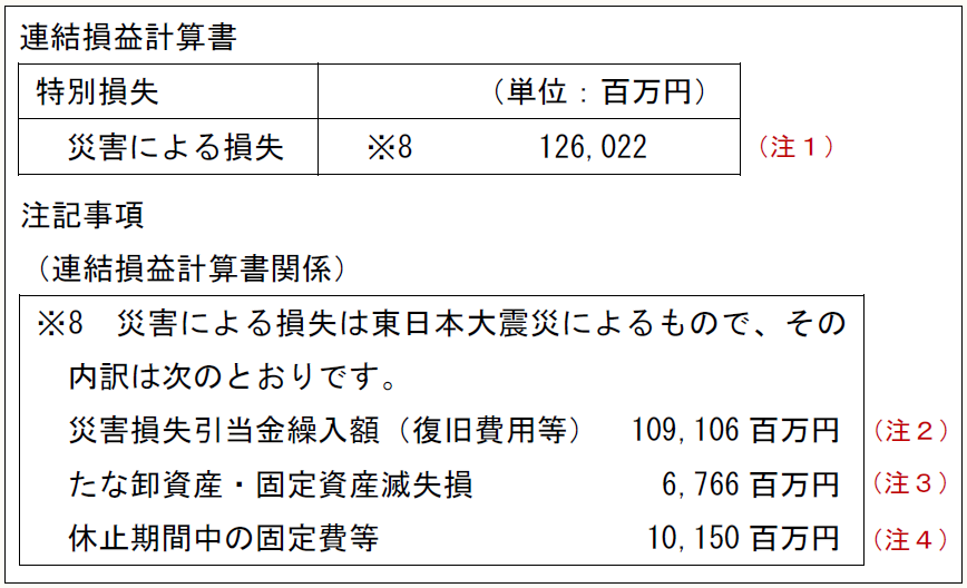 連結損益計算書 特別損失	(単位:百万円)   災害による損失	※8    126,022  注記事項 (連結損益計算書関係) ※8 災害による損失は東日本大震災によるもので、その内訳は次のとおりです。  災害損失引当金繰入額(復旧費用等) 109,106百万円  たな卸資産・固定資産滅失損      6,766百万円  休止期間中の固定費等         10,150百万円